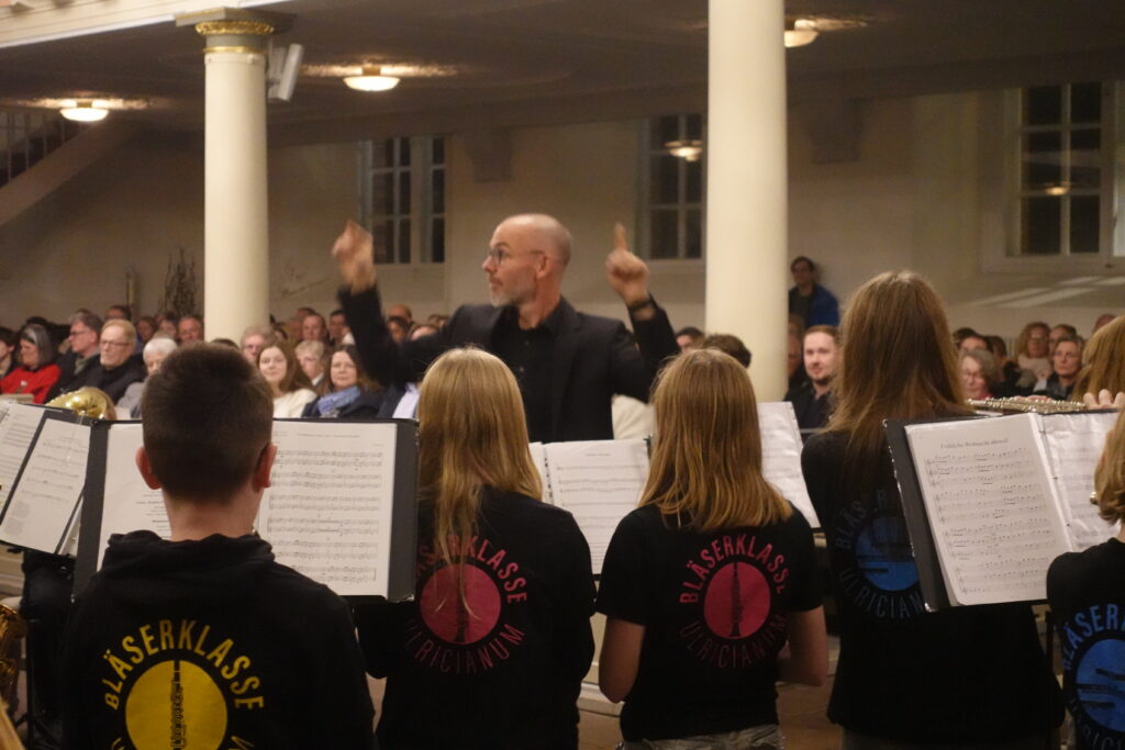 Bereits das dritte Jahr in Folge veranstaltete der Fachbereich Musik ein Weihnachtskonzert in der Lambertikirche. Der Schwerpunkt lag auch in diesem Jahr auf Vorträgen beider Chöre und der Bläserklassen aus dem sechsten und siebten Jahrgang. Zusätzlich stellte sich die bisherige Bläser-AG unter ihrem neuen Namen „Ulricianum Wind Band“ vor. Der Konzertabend fand am 17. Dezember statt und die knapp 200 Mitwirkenden füllten mit ihren Angehörigen sowie weiteren vielen Konzertbesuchern den großen Kirchenraum nahezu vollständig aus. Gut traf es sich, dass gerade am Morgen des Konzerttages der riesige Weihnachtsbaum in der Kirche aufgestellt worden war, so dass auch optisch weihnachtliches Flair die Kirche erfüllte.
