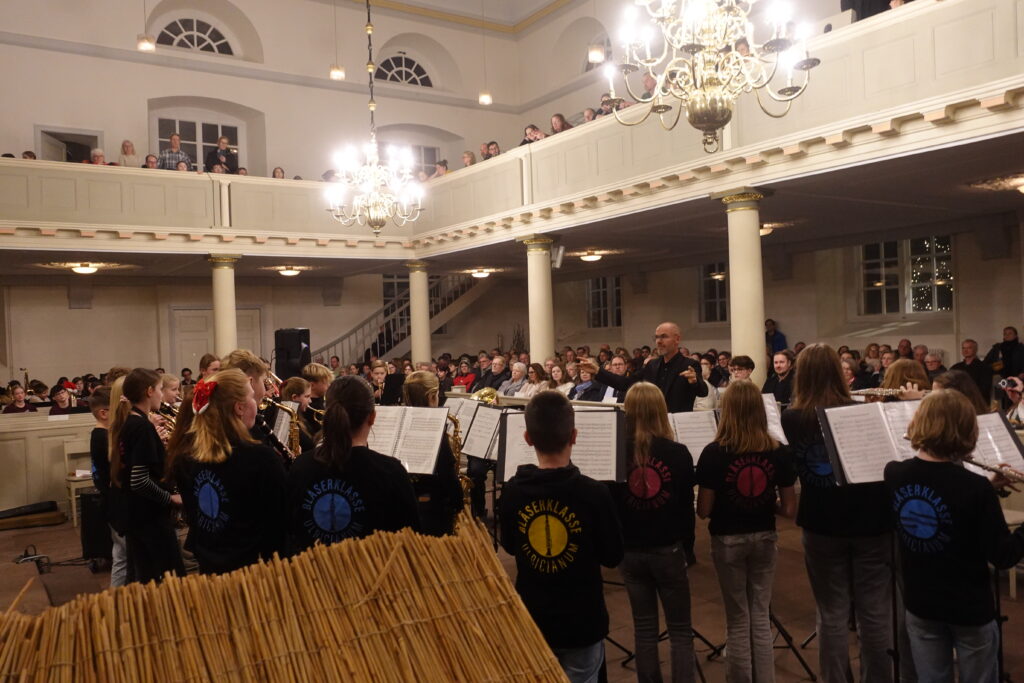 Den Abschluss des Konzertes bildeten drei Stücke der „Ulricianum Wind Band“ die das erste Mal unter diesem Namen auftrat und mit „Carol of the Bells“ aber auch der „Farandole“ von Bizet erlesene Klangkultur und präzises Spiel unter Leitung von Dominik Fakler darbot. Vor dem abschließend von allen Anwesenden zu singenden „O du fröhliche“ appellierte Fachobmann Christoph Otto Beyer an die Spendenbereitschaft des Publikums, diesmal für den Tagesaufenthalt für Obdachlose am Georgswall.