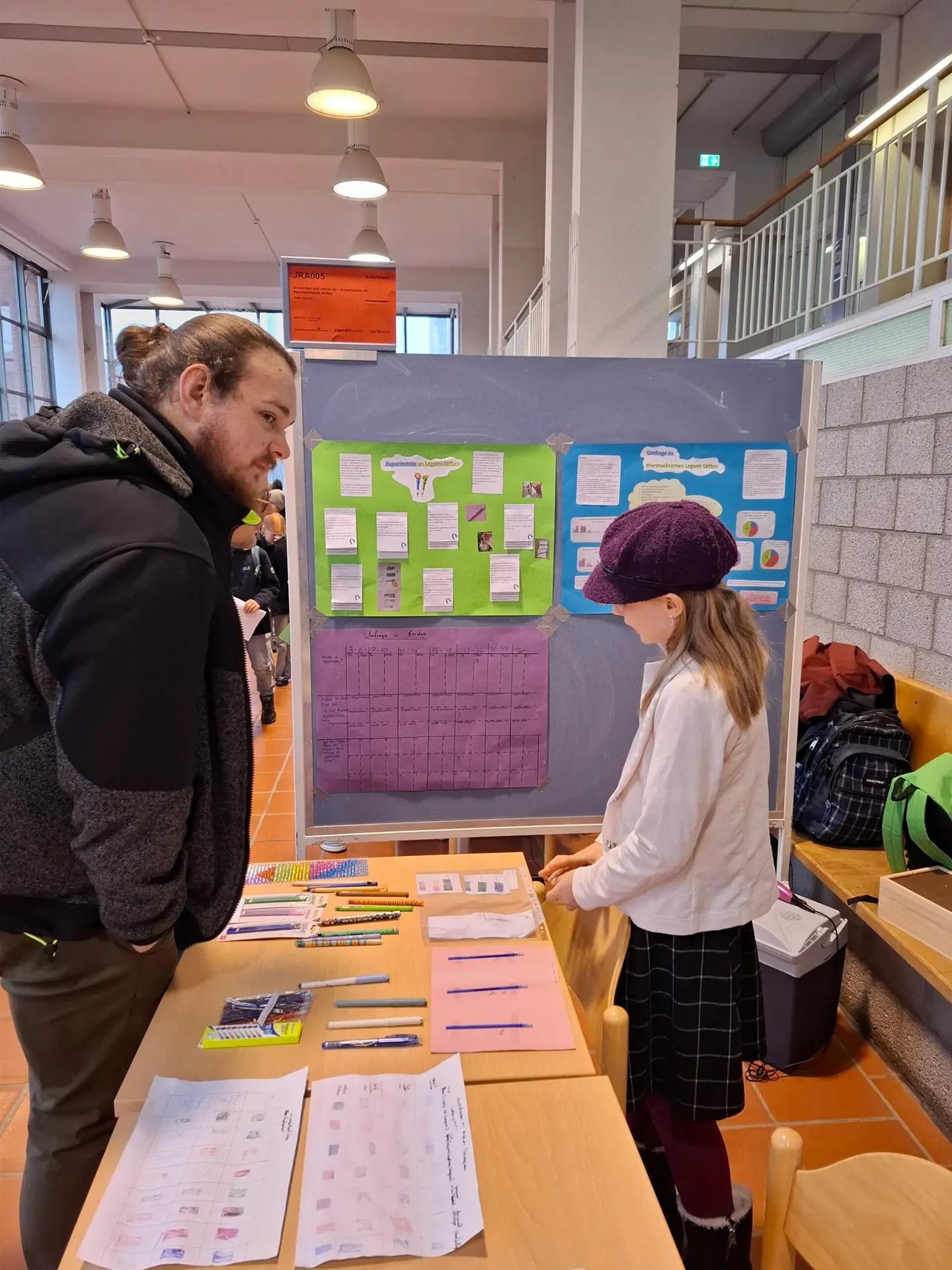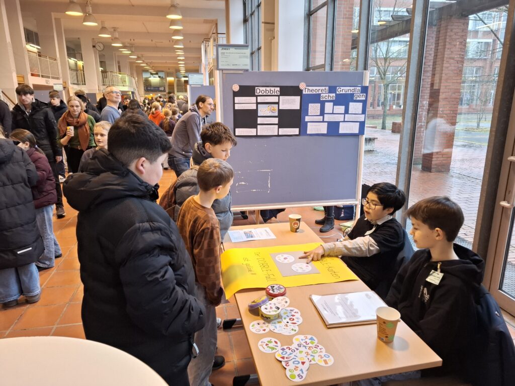 Es war gut zu beobachten, wie die Schülerinnen und Schüler sich an den einzelnen Ständen wirklich in den Bann der Projekte ziehen ließen. Da gab es von fliegenden Teppichen, Tinte aus Naturmaterialen, Messungen von Reaktionszeiten, spannenden Winkeldetektivaufgaben bis zu Haihaut im Schwimmsport so, so viel zu entdecken.