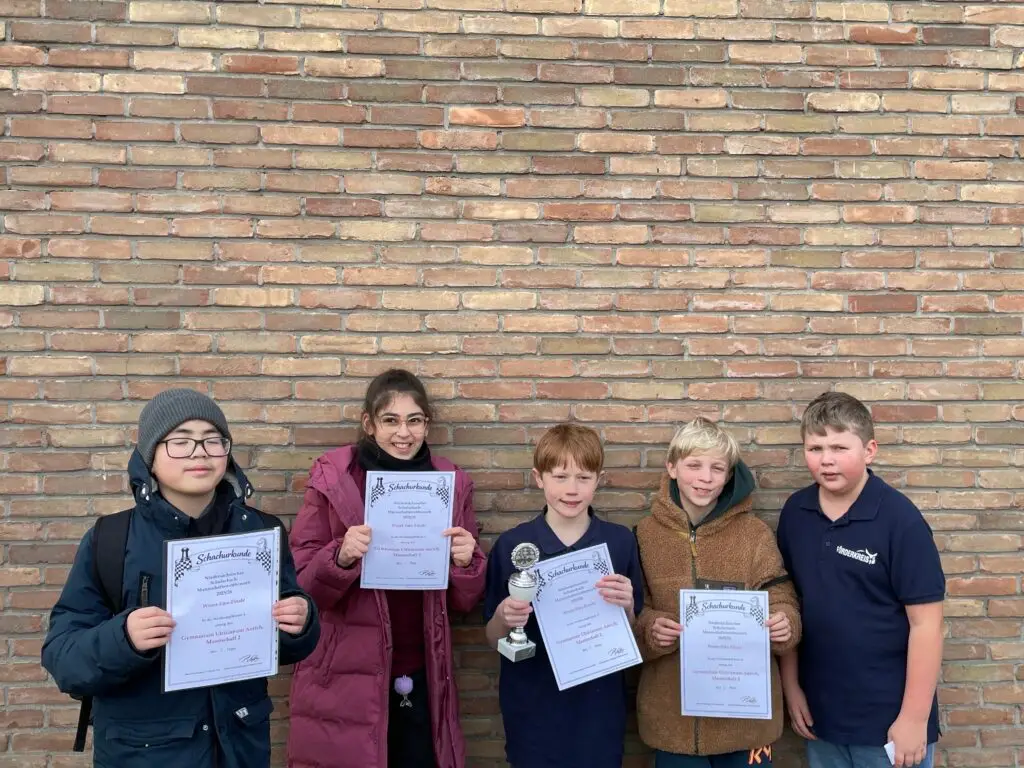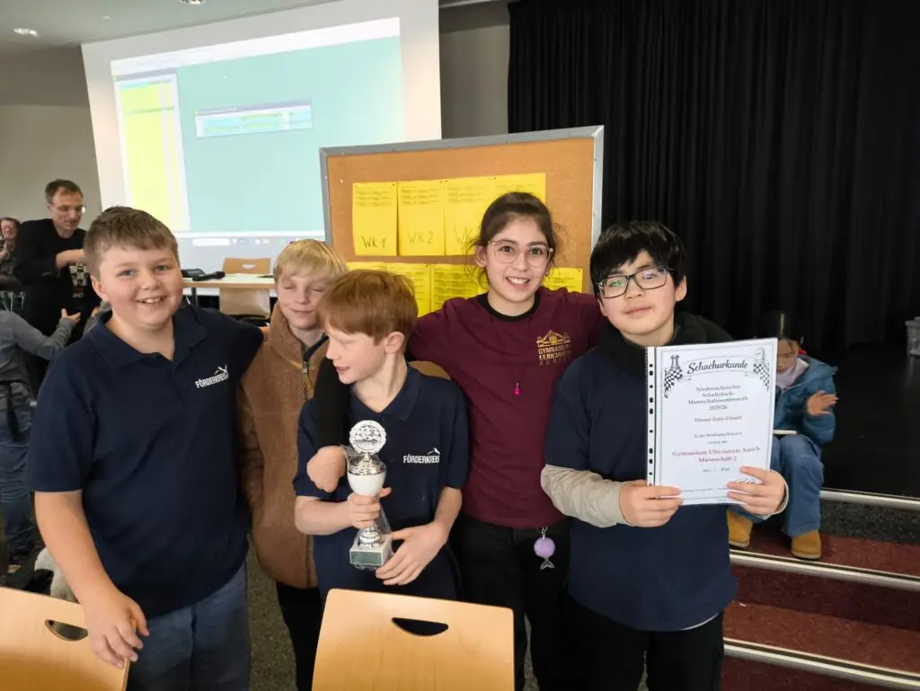 Am 19.02 fand das Weser Ems Finale im Schulschach in Bad Zwischenahn statt. Die drei qualifizierten Mannschaften des Ulricianums reisten zusammen mit 2zwei Mannschaften der IGS Aurich sowie einer Mannschaft der Finkenburgschule zum Turnier an. In der WK2 belegte unsere Mannschaft einen guten 2. Platz mit vielen spannenden Spielen gegen sehr starke Konkurrenz und verpasste damit den Einzug ins Landesfinale in Hannover knapp. Die erste und zweite Mannschaft des Ulricianums belegte in der WK4 die ersten beiden Tabellenplätze, sodass sich dort beide Mannschaften für das Landesfinale qualifiziert haben.