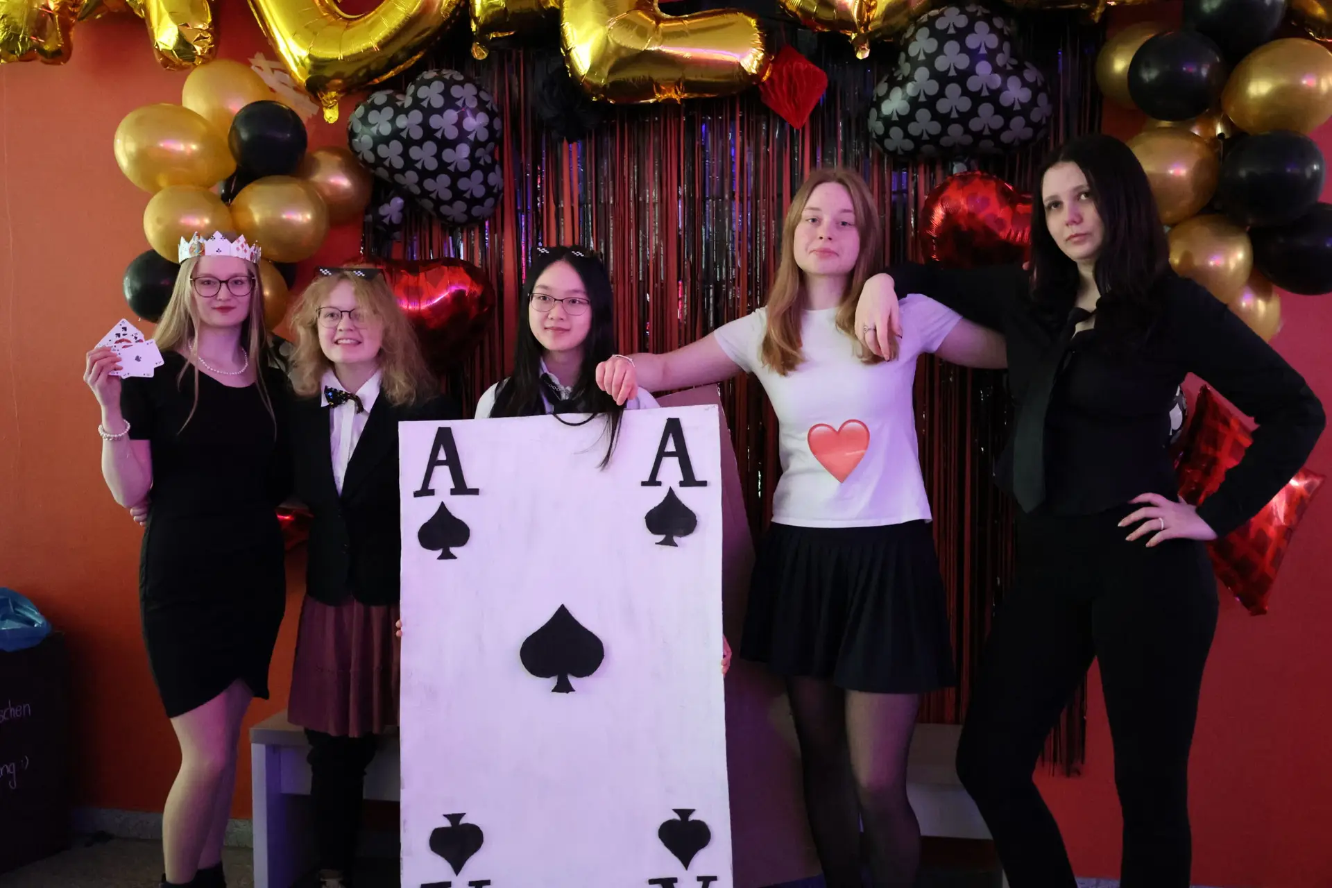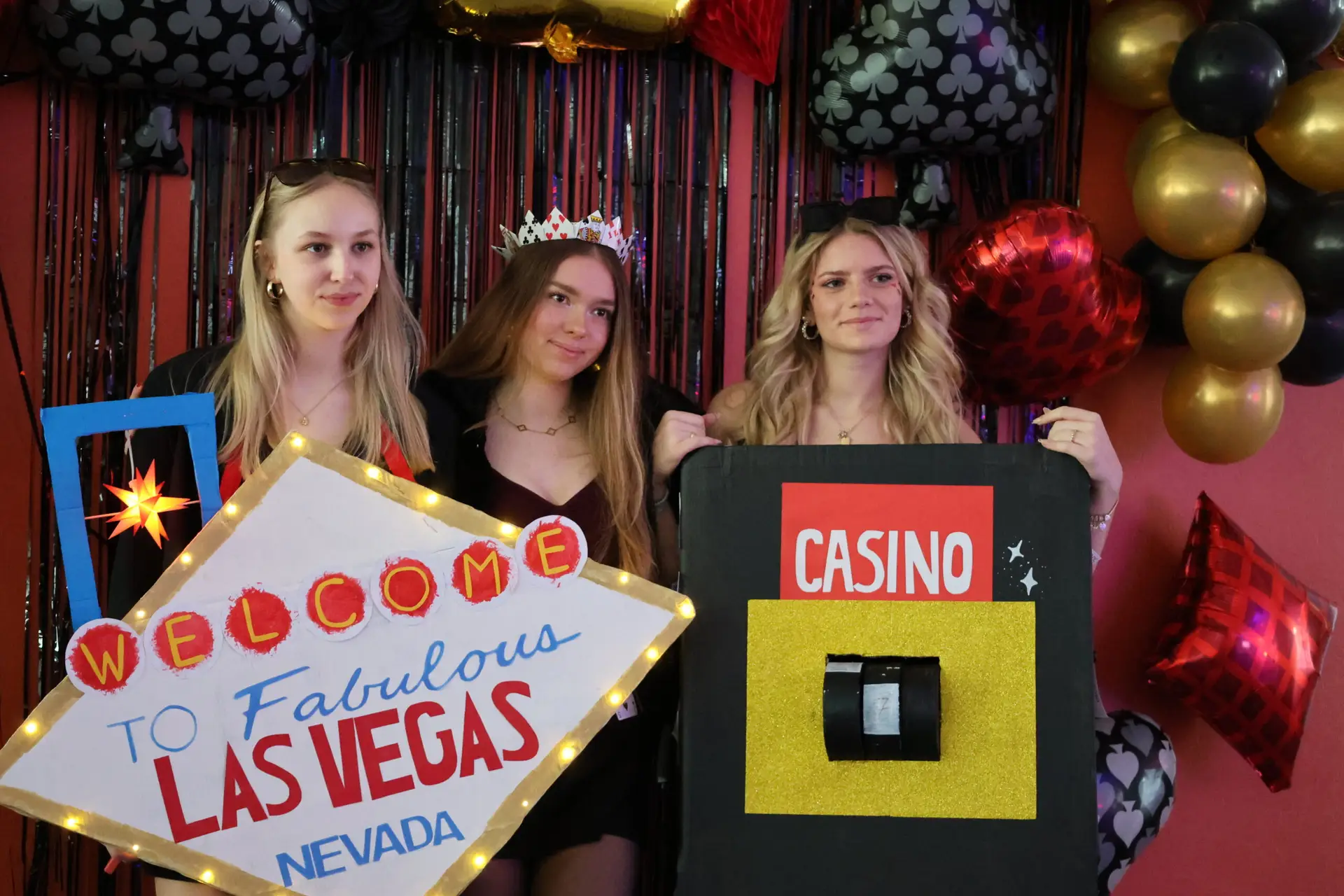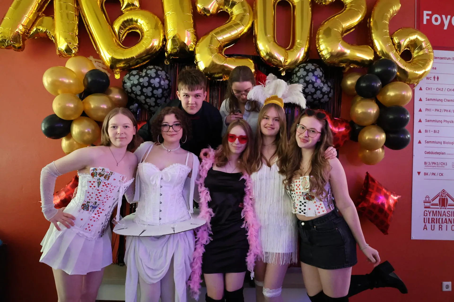 Las Vegas – Geld, Roulette, Poker, High Society, Party: All das wurde heute nach Aurich in unser Foyer geholt, dank unserer Abiturienten. Diese haben nämlich ihren Schultag wie in Las Vegas verbracht – zumindest was die Kleidung betrifft; der Rest wird auf Vegas warten müssen…